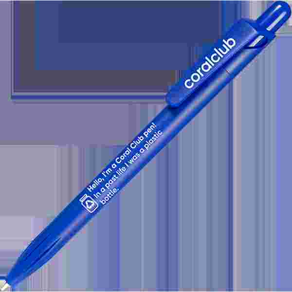 עט כדורי עם מנגנון לחיצה מחומר PET-RECYCLED עם כיתוב ״היי, אני העט של Coral Club! בחיי הקודמים הייתי בקבוק פלסטיק״.