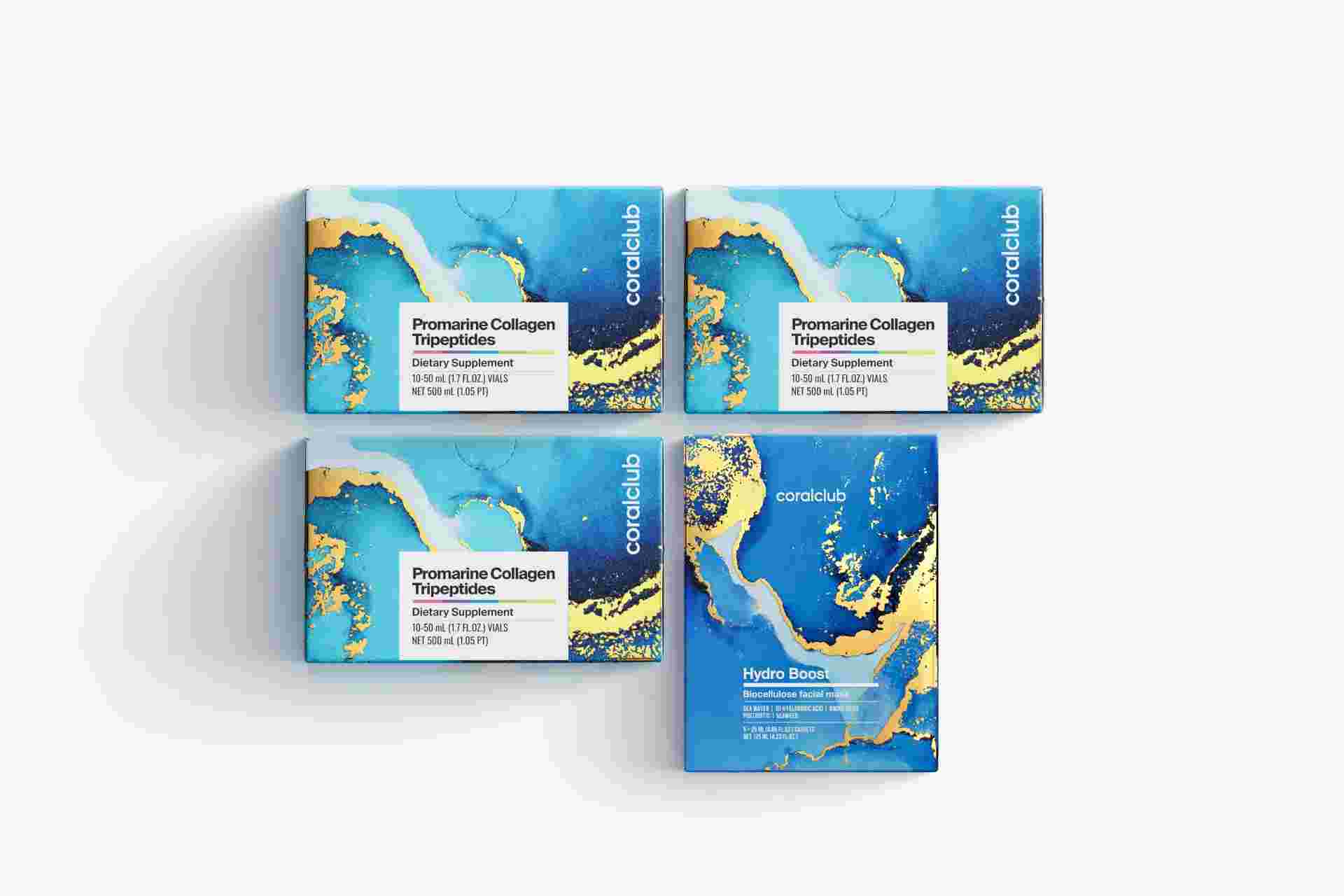 ערכת פרומרין טריפפטידים של קולגן (לתקופה של חודש) & מסכות ביו-צלולוז Hydro Boost לעור הפנים (5 אריזות אישיות)